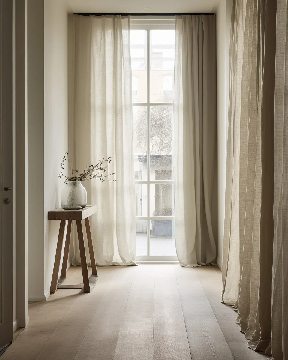 Ceiling-to-floor textiles in natural linen bring warmth and texture to this hallway, bridging the transition from cozy living space to a more modern kitchen.